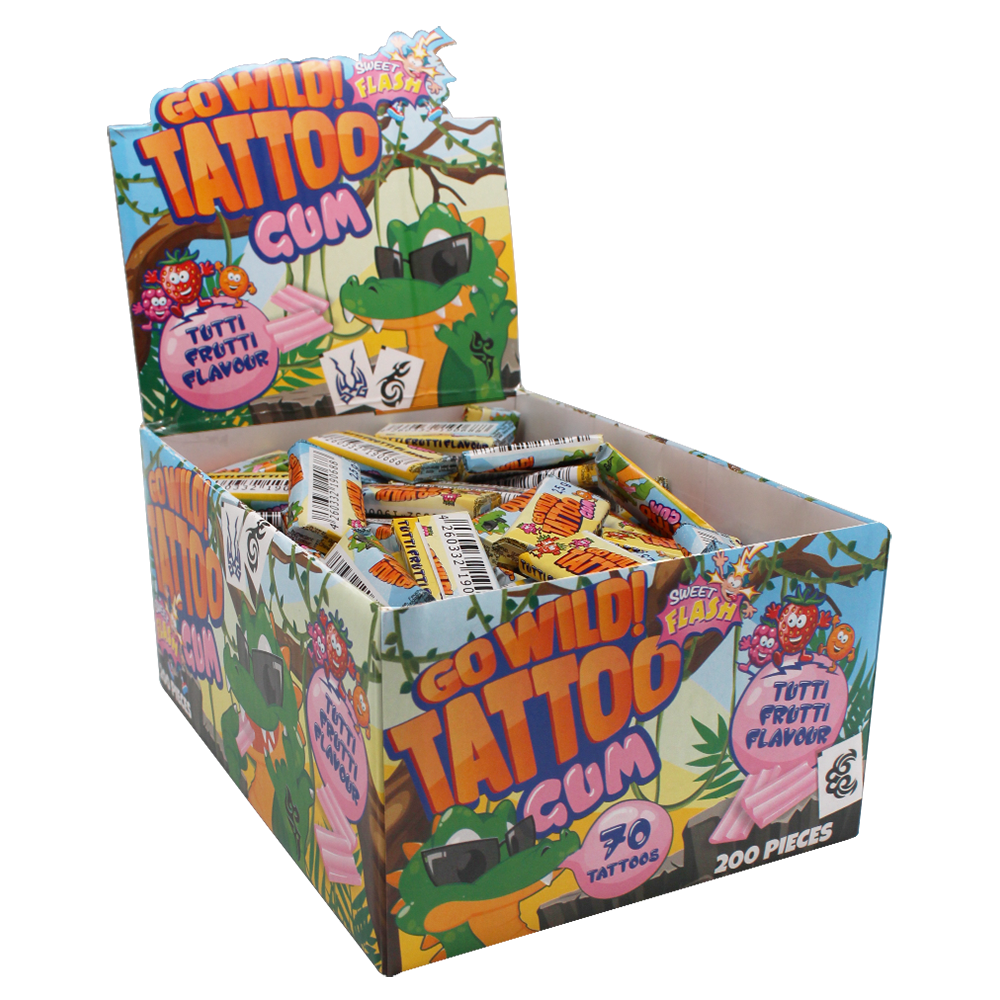 Go Wild! Tattoo Gum sind 200 einzeln verpackte Kaugummis im klassischen Tutti Frutti Geschmack. In jedem Kaugummi befindet sich ein Tattoo. Einfach auf die gewünschte Hautstelle legen, leicht anfeuchten und schon kann es losgehen. Es handelt sich um Tattoo im Dschungel Stil. Ein riesen Spaß für den Kindergeburtstag.