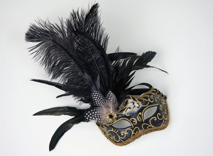 Farbe: schwarz -venezianische Augenmaske mit Federn, schwarz —Material: PS -Warnhinweis: Karnevalsartikel, kein Kinderspielzeug! Naturprodukt, kann abfärben! Achtung, vom Feuer fernhalten!