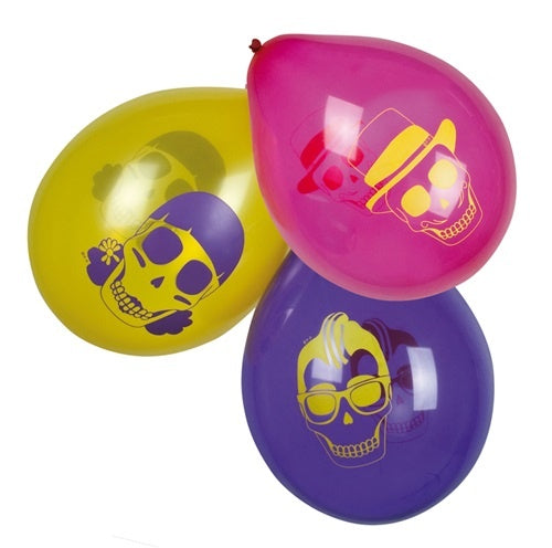 Perfekt für Halloweenparties uä, sind diese Ballons. Sie sind in 3 Motiven sortiert – gelb mit weiblichem Totenkopf, schwarz mit männlichem Rock n Roll-Totenkopf und rot mit männlichem Totenkopf mit Hut. Alle Motive sind im Comicstil gehalten.