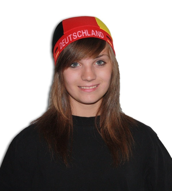 Das Bandana wird in Deutschlandfarben mit Flaggen- und ‚Deutschland‘ – Aufdruck geliefert.