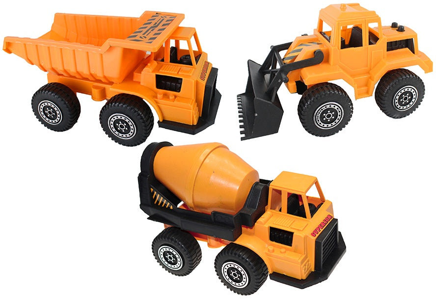 – Ausführungen: Kipplaster, Betonmischer, Radlader (Die Sortierung erfolgt zufällig, Auswahl nicht möglich. Keine Garantie für gleichmäßige Sortierung )