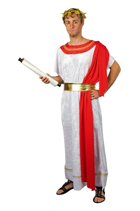 Toga aus Pannesamt mit Schulterschärpe und goldenem Gürtel. -Größe: Univ. -Farbe: weiß/rot -Gewand —Material: 100% PES, Schärpe —Material: 95% PES, 5% EL, Gürtel —Material: 95% PES, 5% EL –