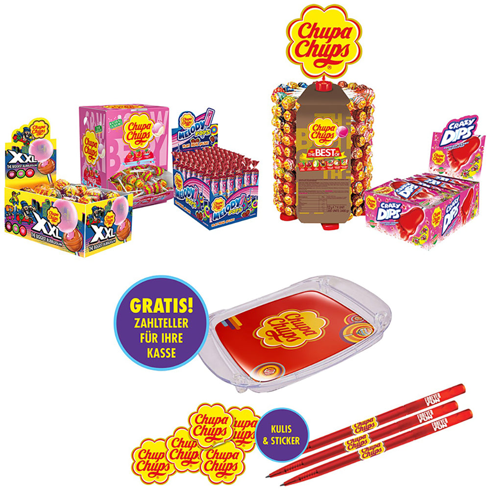 Hier bekommt man die ganze Welt von Chupa Chupa. In diesem Aktionspaket sind nicht beliebtesten Lollys. Man spart nicht nur 6 Euro gegenüber dem Einzelkauf, sondern bekommt auch noch einen Zahlteller, 3 Kullis und 5 Sticker von Chupa Chups gratis dazu.