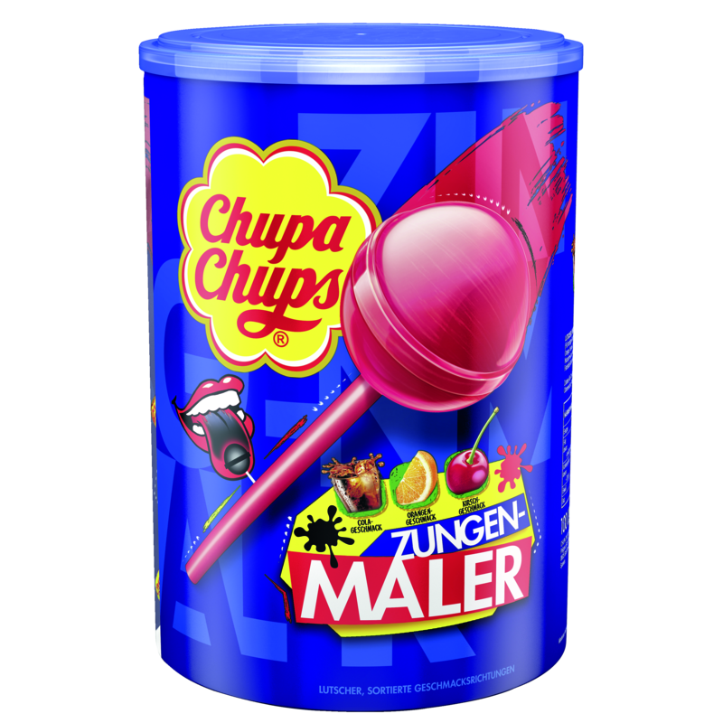 Chupa Chups Zungenmaler ist ein färbender Lutscher. Damit kann dieser Lolly verschiedene Farben auf deine Zunge zaubern. In den Gschmacksrichtungen Cola, Orange und Kirsch. Hier bleibt kein Auge und keine Zunge trocken. Jetzt probieren!