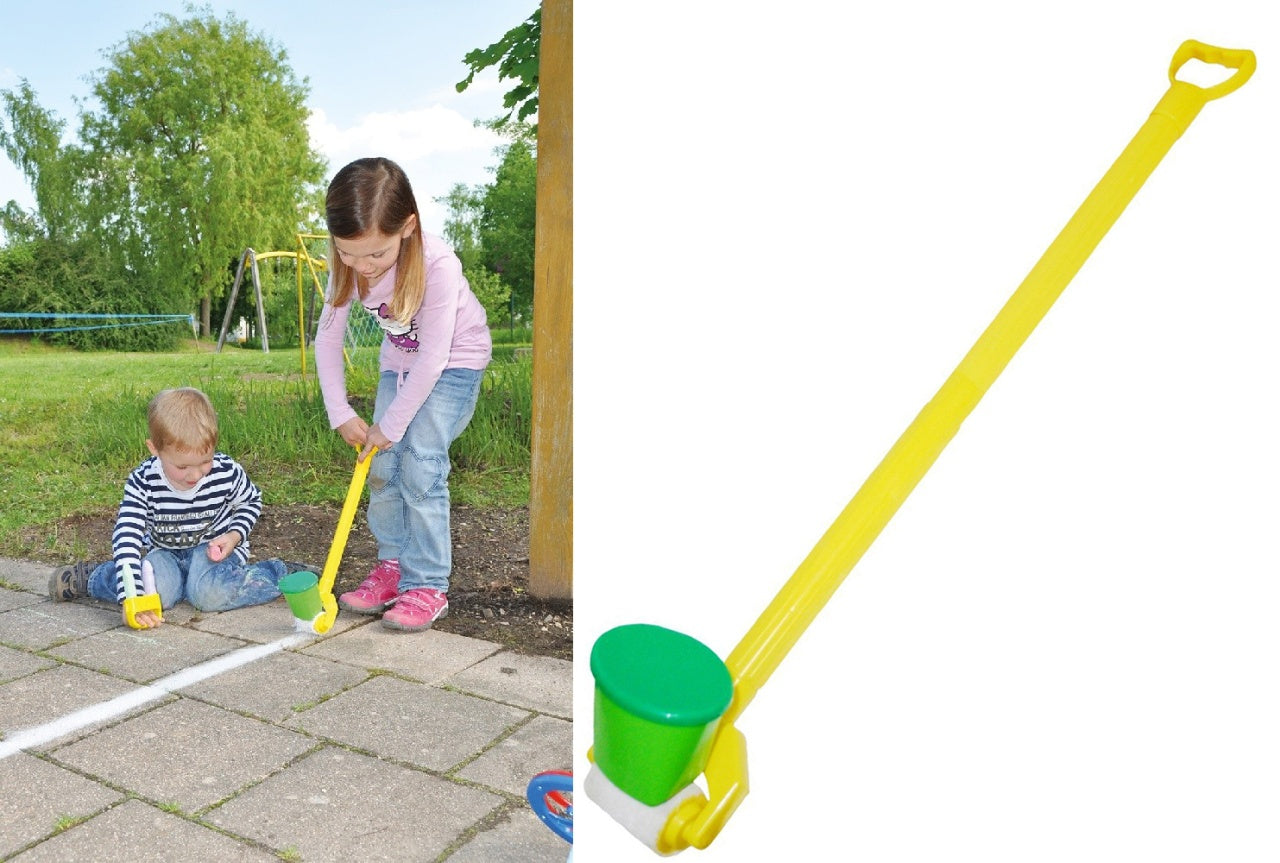 Einfach das mitgelieferte Kreidepulver in den Behälter einfüllen. Die Textilwalze nimmt das Kreidepulver auf und hinterlässt eine 5 cm breite Spur auf Rasen oder Asphalt.