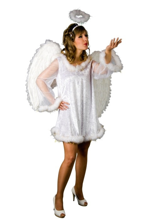 Weitschwingendes Kleid aus Pannesamt mit Chiffonärmeln und Marabubesatz. Der Verschluss am Rücken ermöglicht das Tragen von Flügeln. -Größe: 42-46 -Farbe: weiß -Engelskleid Serafina, Gr. 42-46 —Material: 100% PES –