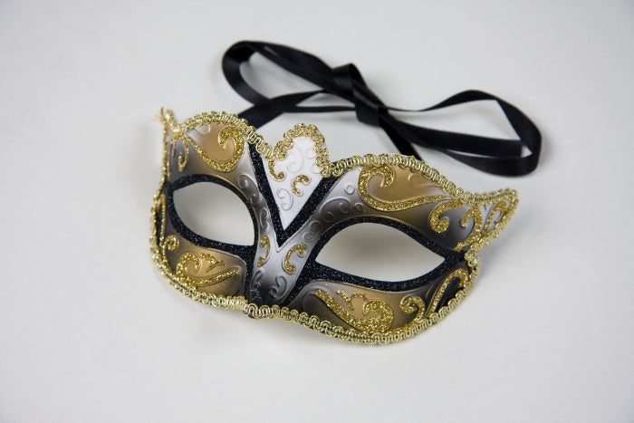 Farbe: schwarz/gold -venezianische Glitter-Augenmaske, schwarz/gold —Material: PS -Warnhinweis: Karnevalsartikel, kein Kinderspielzeug!