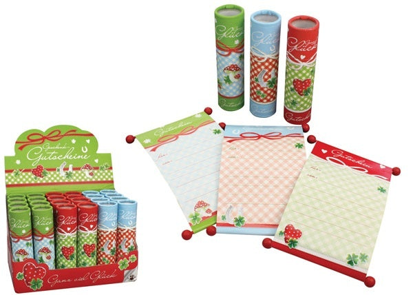 – Material: Rolle aus stabiler Pappe, Gutschein aus stabilem Papier und Holz