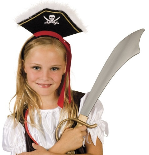 Der schwarze Haarreif ist mit einem roten Band mit Schleife und einem Piratendekor mit Federbesatz verziert.