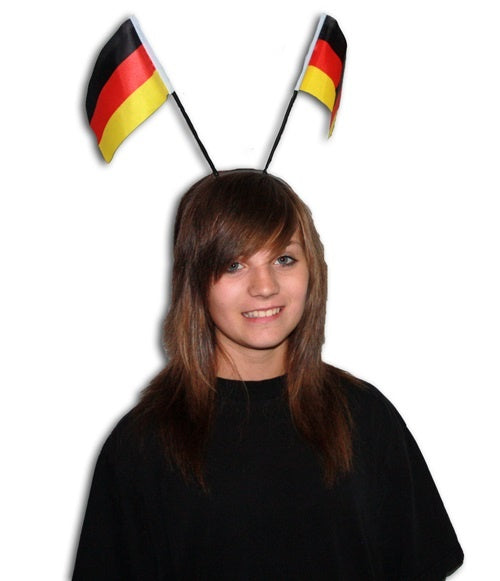 Der schwarze Kunststoffhaarreif wird zusammen mit 2 Deutschlandfähnchen geliefert. Die Fähnchen werden auf die 2 kleinen Nippel am Haarreif gesteckt