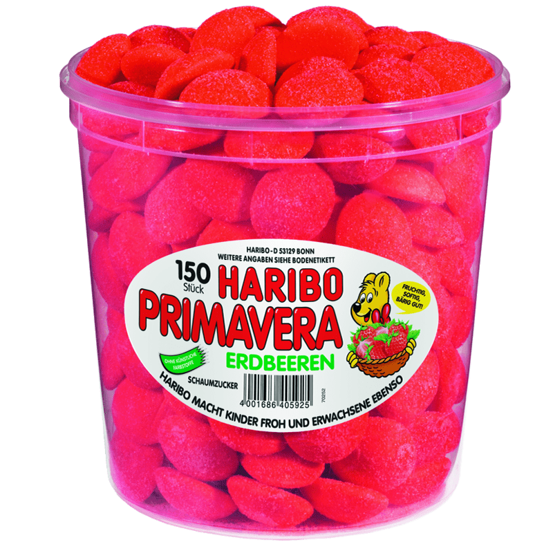 Fruchtig, softig, beerig gut HARIBO PRIMAVERA ERDBEEREN haben einen soften Schaumzuckerkern und eine süß-kandierte Erdbeerumhüllung. Der Klassiker im HARIBO-Schaumzucker-Sortiment!