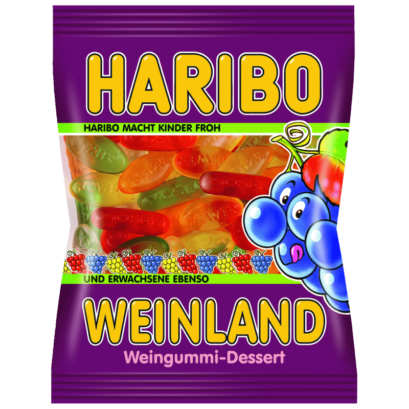 HARIBO WEINLAND beinhaltet aromatische Fruchtgummistücke in besonders weicher Konsistenz in den fruchtigen Geschmacksrichtungen Ananas, Erdbeere, Himbeere, Saftorange und Zitrone, welche mit Flussnamen bekannter Weinanbaugebiete gezeichnet sind.