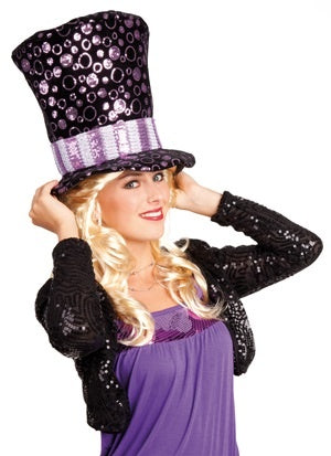 Der Hut wird in schwarz geliefert. Er ist mit violetten Pailetten verziert. Um den Hut herum ist ein fliederfarbenes Band angenäht, das mit weißen und violetten Pailetten verziert ist.