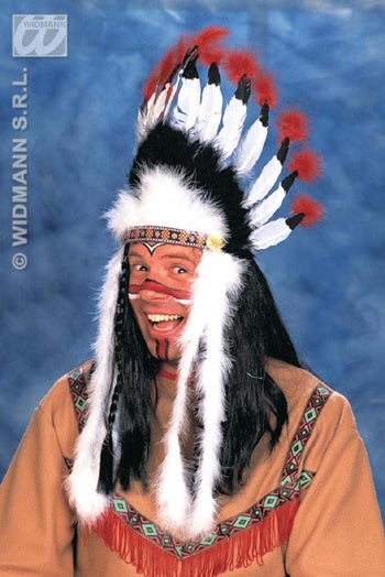 Der Indianerkopfschmuck besteht aus 1 Federbogen mit weiß/schwarzen Federn und roter Spitze und 4 hängenden Federbesätzen. Der Kopfschmuck ist mit einem Gummiband ausgestattet. So kann man den Kopfschmuck leicht aufsetzen.