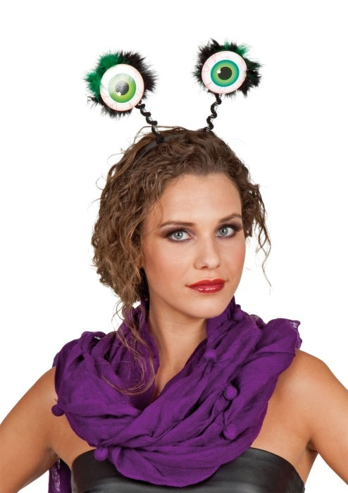 Farbe: schwarz/grün -Kopfbügel mit grünen Glubschaugen —Material: Metall, ABS, Truthahnfedern -Warnhinweis: Karnevalsartikel, kein Kinderspielzeug!
