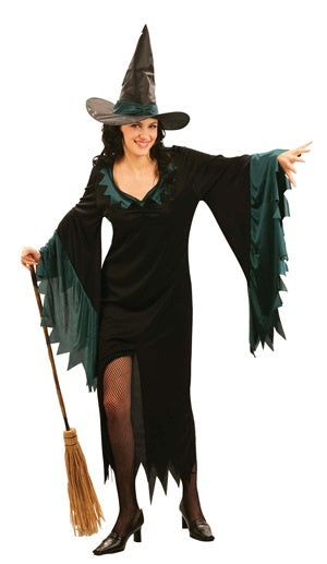 Das Hexen-Kleid ist schwarz und dunkel grün/blau abgenäht. Die Ärmel des Kleides laufen sehr weit aus. Zusätzlich wird ein farblich passender Hexenhut geliefert.