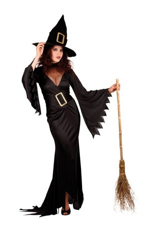 – langes schwarzes, enganliegendes Kleid mit tiefem Dekoltee und Trompetenärmeln