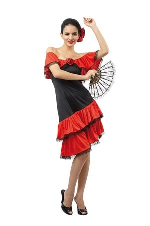 Das Kostüm besteht aus einem scchwarz/rotem Kleid im spanischem Stil und einer Haardeko, die mit dem angebrachtem Kamm im Haar festgesteckt wird.