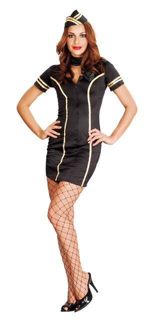 Das Stewardess-Kleid ist schwarz mit Goldstreifen verziert.