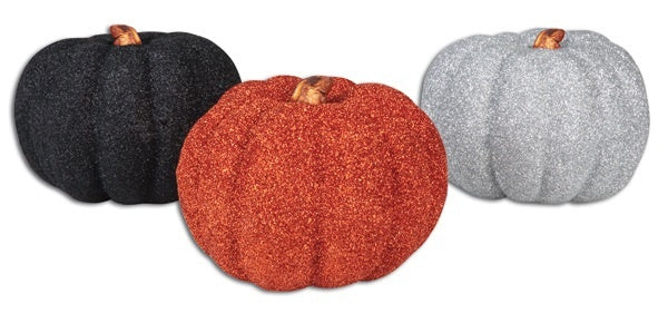 Die Kürbisse werden in schwarz, orange und silber sortiert geliefert. Sie sind mit Glitzer verziert. Der Preis versteht sich für 1 Kürbis.