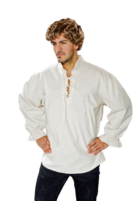 Ein vielseitig einsetzbares rustikales Herrenhemd mit Schnürung am Vorderausschnitt und Gummizug in den Ärmelbündchen. -Größe: 54/56 – -Hemd —Material: 50% CO, 50% PES –