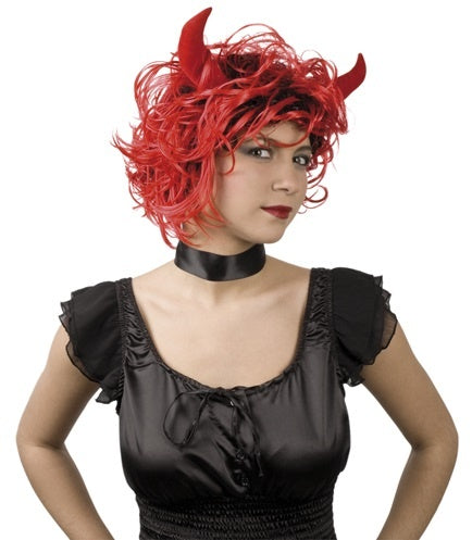 Die Perücke ist eine Kurzhaarfrisur in knallrot mit schwarzen Locken am Ansatz und mit roten Hörnern.