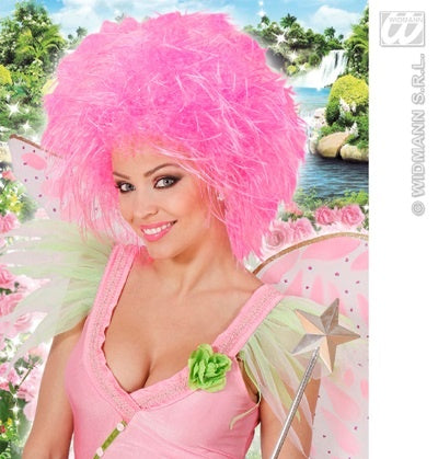 Die Perücke wird in pink geliefert. Es handelt sich um eine bauschige Frisur mit teilweise gelockten Haaren.