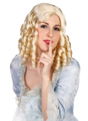 Die Perücke wird in hellblond geliefert. Es handelt sich um eine mittellange Frisur mit Korkenzieherlocken.