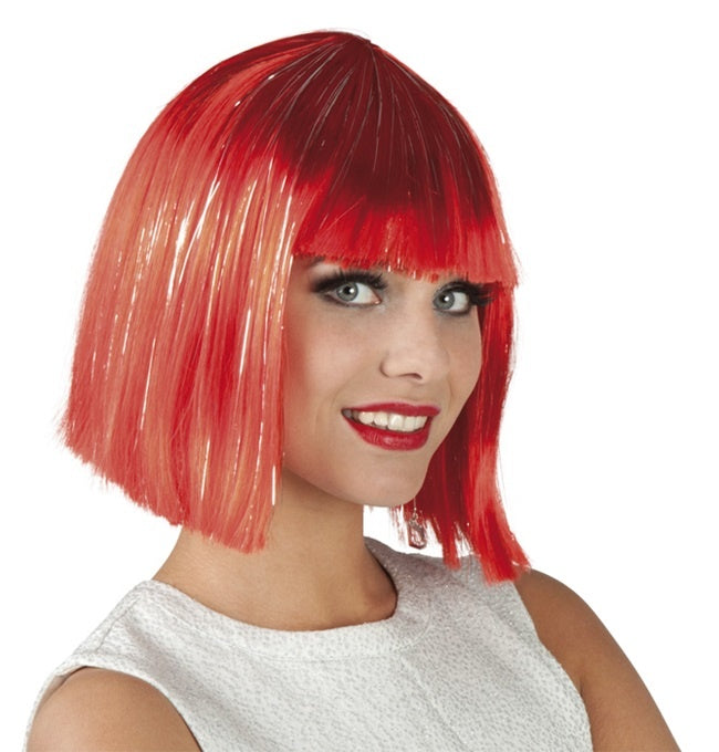 Die Perücke wird in rot mit silber Lametta-Strähnen geliefert. Es handelt sich um eine Bob-Frisur mit Pony.