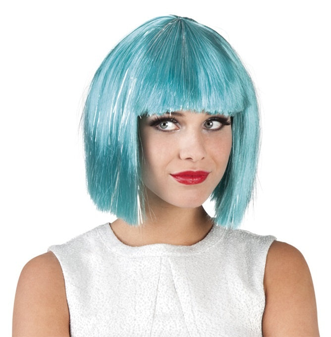Die Perücke wird in türkis mit silber Lametta-Strähnen geliefert. Es handelt sich um eine Bob-Frisur mit Pony.