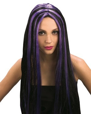 Perücke – Hexe Langhaar schwarz mit lila Streifen