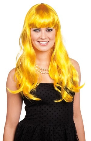 Die Perücke ist eine Langhaarfrisur mit Pony und wird in gelb geliefert.