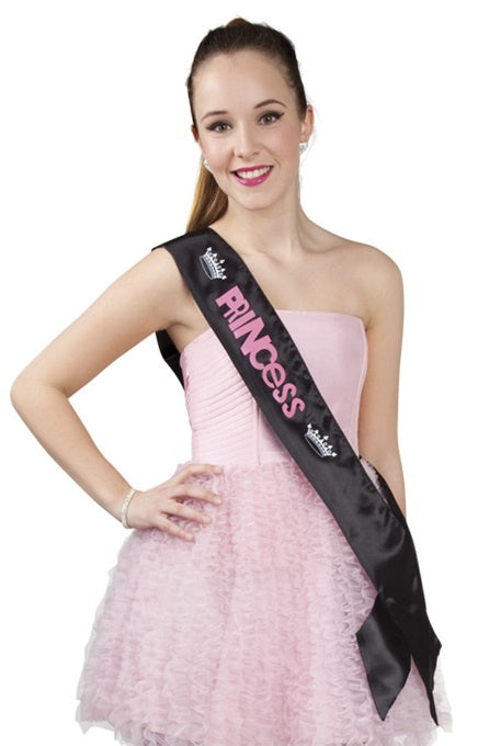 Sie wird in schwarz mit rosa ‚PRINCESS‘-Aufdruck und weißen Kronen geliefert.
