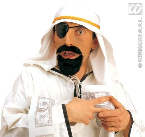 Das Scheichset besteht aus einem weißen Tuch für den Kopf (mit gelber Kordel), einem Bart zum Ankleben und einer Augenklappe aus Gummi.