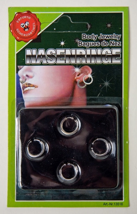 Farbe: silber -Set aus vier Piercingimitaten, sortiert —Material: PP -Warnhinweis: Achtung! Für Kinder unter 36 Monaten nicht geeignet. Kleine Teile. Verschluckungs-und Erstickungsgefahr! Hersteller und Adresse aufbewahren.