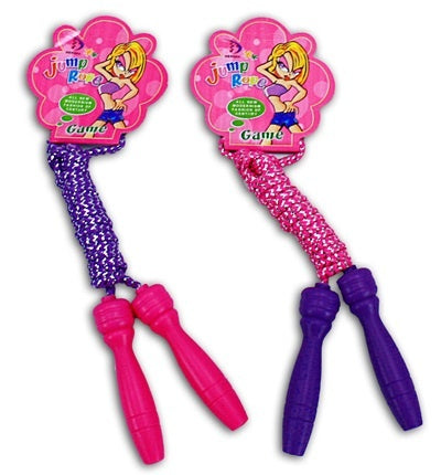 Das Springseil misst inkl. Griffe ca 2,2m. Es wird sortiert in pink mit lila Griffen und lila mit pinken Griffen geliefert. Das Seil ist je mit silbernen Glitzerfäden versehen.