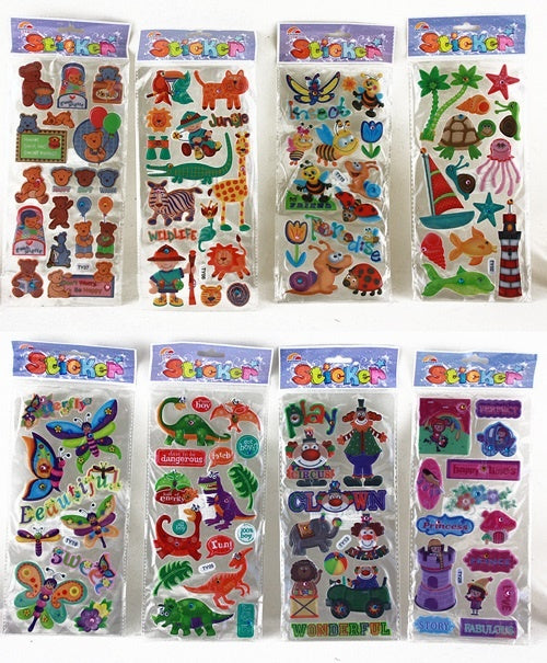 Auf einer Karte befinden sich zwischen 10 und 20 einzelne Sticker (wenn nur 10 auf der Karte sind, sind diese dementsprechend größer) von sortierten Motiven – Clownmotive, Prinzessinenmotive, Fischmotive, Bärenmotive,….. Es handelt sich um „aufgepolsterte“ Sticker, mit einem schönen 3d-Effekt. Der Preis versteht sich für 1 Karte mit Stickern.