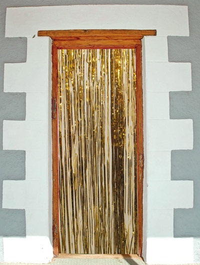 Der Türvorhang misst ca 2m in der Länge und ca 1m in der Breite. Er besteht aus goldfarbenen Lamettafäden. Der Vorhang wird in den Türrahmen geklebt. So kann man wunderbar einen Partybereich abtrennen….