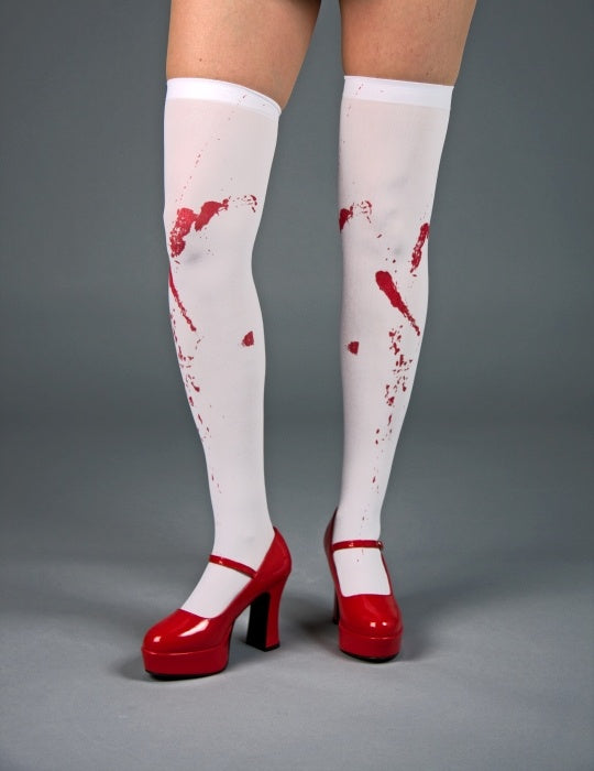 -Größe: Univ. -Farbe: weiß/rot -Überkniestrümpfe mit Blutflecken —Material: 100% PA –