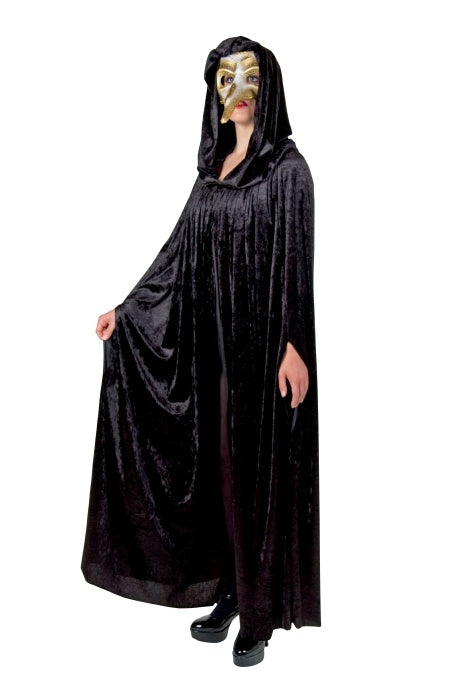 Der Kapuzenumhang aus schwarzem Pannesamt garantiert einen geheimnisvollen Auftritt! Seitenschlitze ermöglichen das Herausstrecken der Hände. -Größe: Univ. -Farbe: schwarz -Umhang —Material: 100% PES –