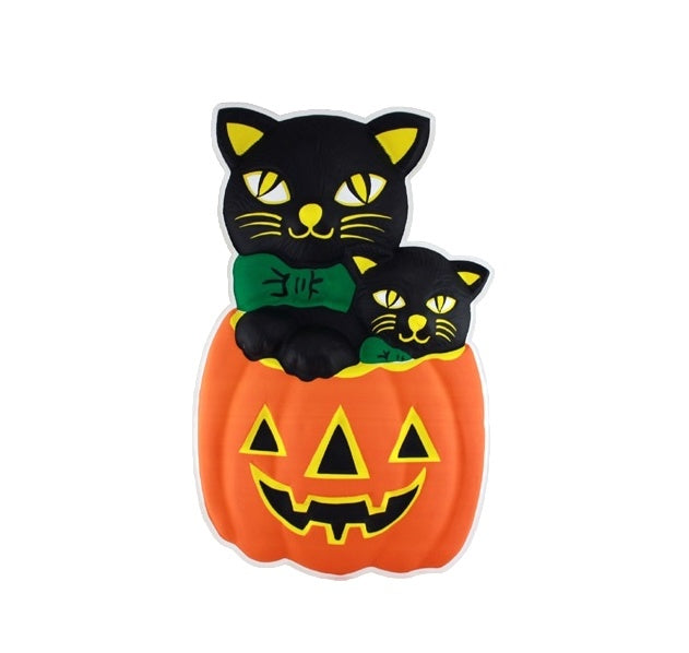 Die Wanddeko besteht aus einem lachendem Kürbis und 2 schwarzen Katzen. Super für Halloween.