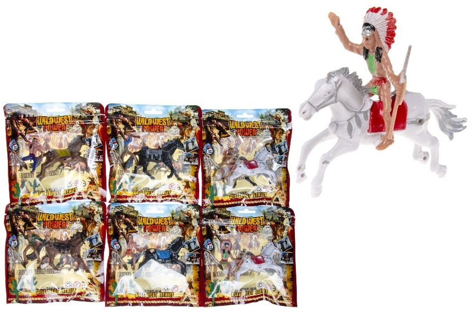 – Sortierung: 6-fach, Pferd in weiß, braun, schwarz sortiert je mit Indianer oder Cowboy (die Figuren variieren)