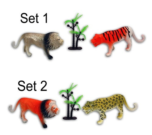 Die Wildtiersets werden 2-fach sortiert geliefert – mit Löwe (ca 12cm), Leopard (ca 12cm) und Palme (ca 8,5cm) und mit goldenen Löwen (ca 12cm), Tiger (ca 12cm) und Palme (ca 8,5 cm). Die Sets bestehen aus Kunststoff.