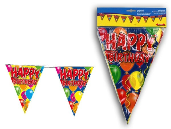 Die ca 10m lange Wimpelkette besteht aus 15 ca 30x21cm großen dreieckigen Wimpeln, diese sind beidseitig bedruckt.