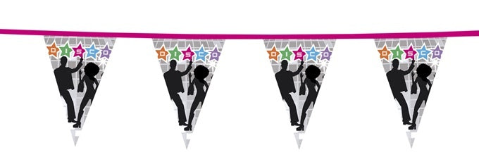Die Wimpelkette misst ca 6 m. Die einzelnen Wimpel sind mit einem bunten Diskomotiv versehen (einseitig) Ein Wimpel misst ca 29 x 20 cm. Das Material ist Folie.